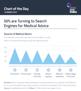 According to GWT, “Exactly half say they go to search engines and 46% are using medical websites, giving some context for the rise of online symptom checkers and medical advice sites, like Web MD and the UK’s NHS Choices service.”